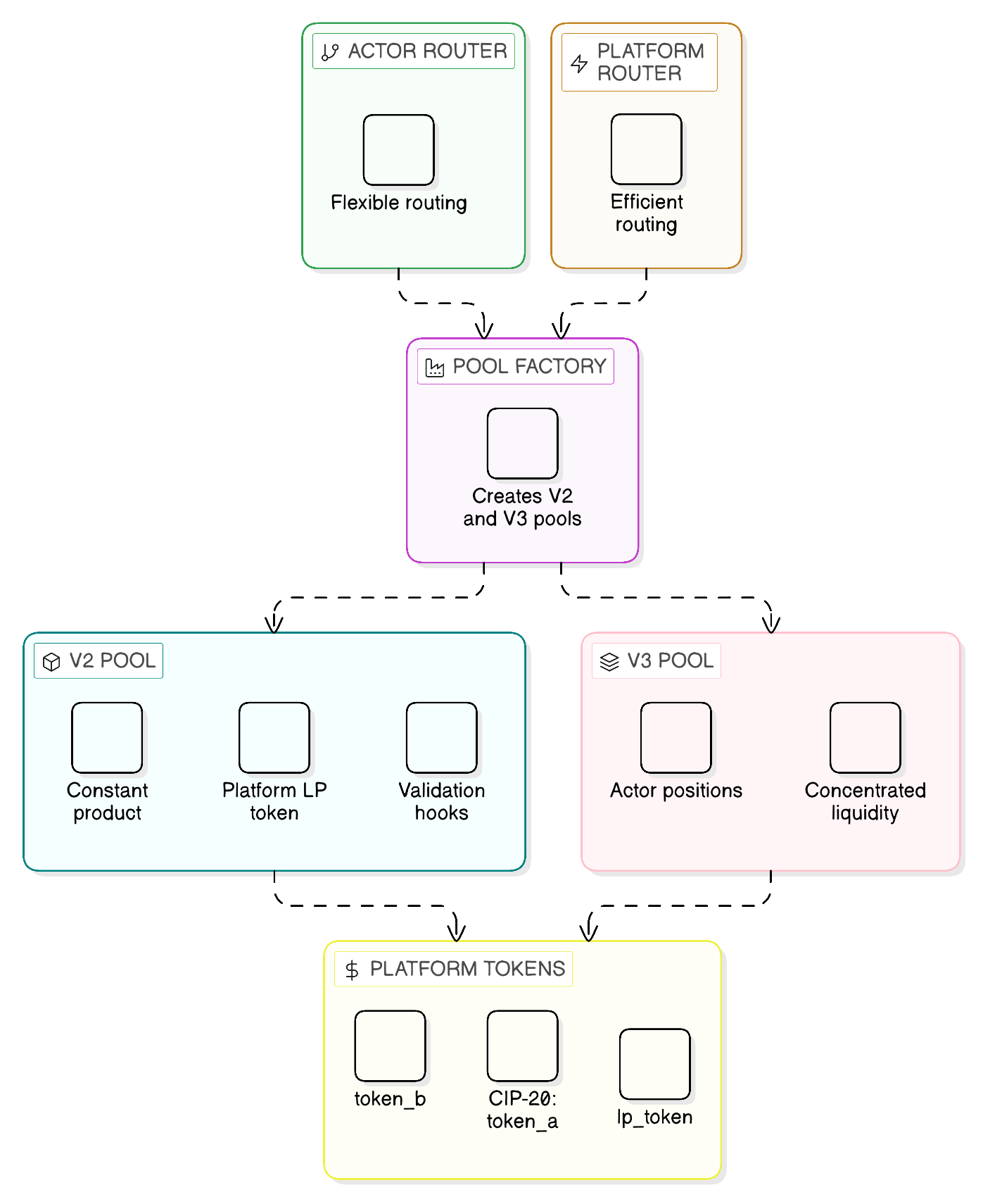 can_swap/on_swapfor compliance and MEV protection - Dual routing: Actor-based router for flexibility, platform primitive for efficient multi-hop